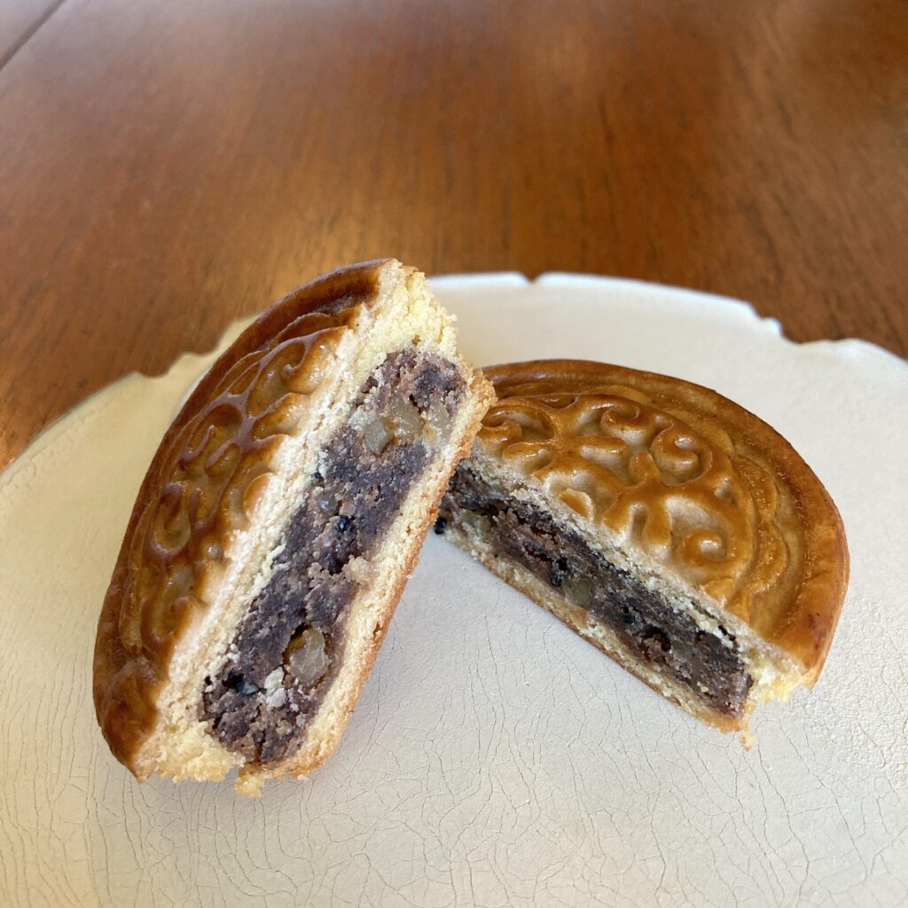中秋節に合わせて期間限定で販売されるウエストの月餅。特徴的なのは、外生地がガレット・デ・ロワをベースにしたオリジナルの生地。サクッと系なのかなと思いきや、思いの外しっとりしていてパサつきなく中の餡とマッチ。ほろほろと崩れる食感を想像していたのですが、絶妙のしっとり具合で柔らかな口溶けが大変美味です。ガレット・デ・ロワというだけあってバターの香りがとても良いのが、さすが洋菓子の老舗、銀座ウエストの焼き菓子といったところ。餡は「塩瀬総本舗」の餡を使用し、胡桃や栗、黒胡麻が配合されていて食感が楽しい餡子です。裏の表示成分を確認してみると黒糖の他にコーヒーという表示もあり、風味良い餡に仕上がっています。