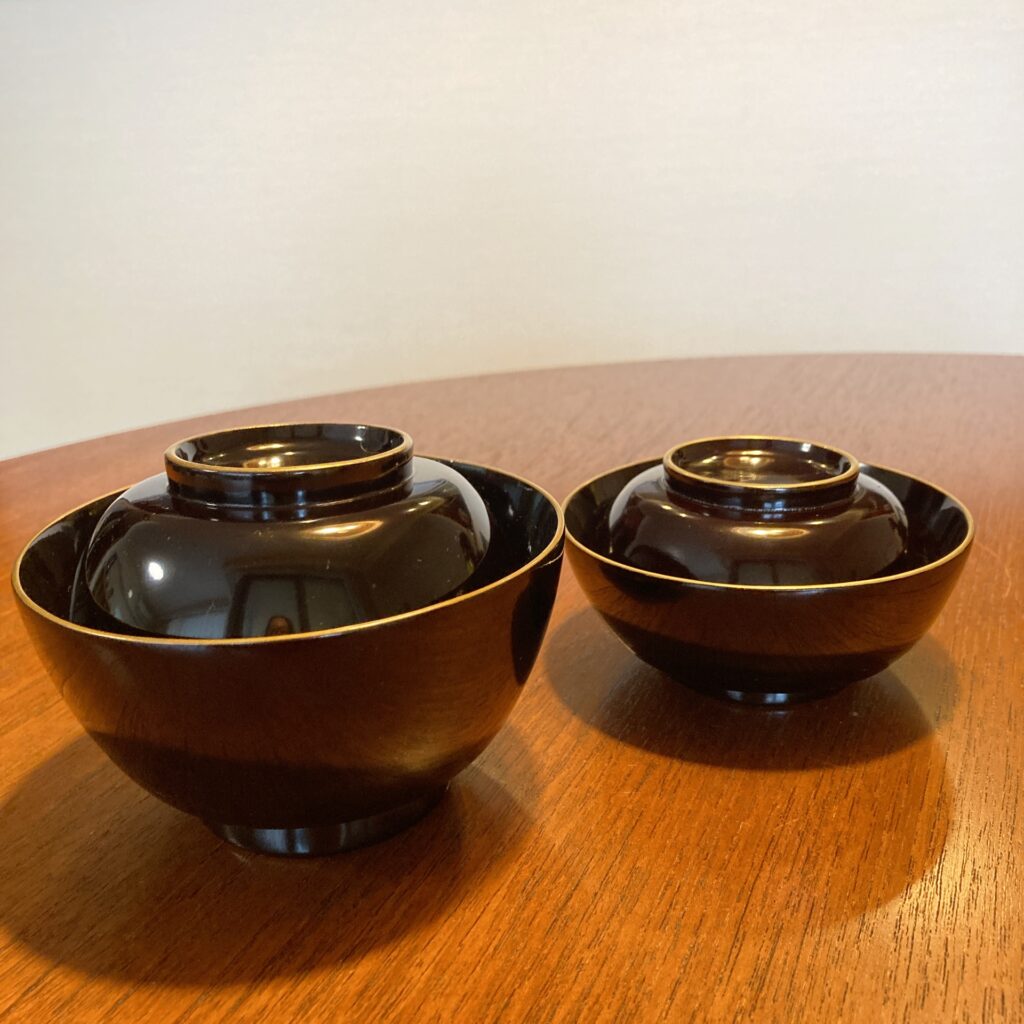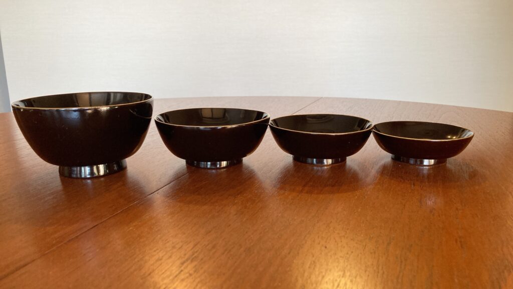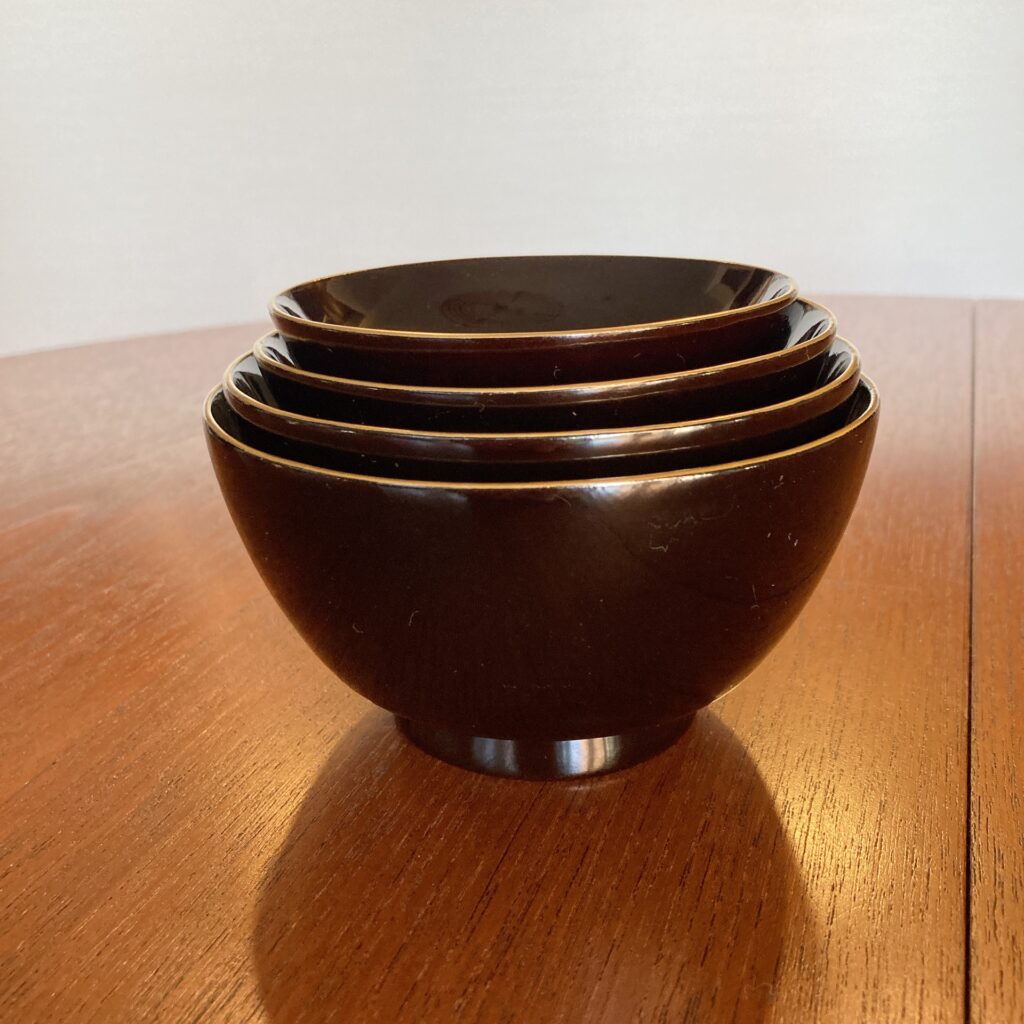 そんな折、日常使いの古い器や骨董などを時々購入しているオンラインショップ「逢季荘」さんで出逢ってしまったのが、こちらの四ツ椀。明治時代の輪島塗縁金黒漆の保存状態の良い漆器椀。通称「四ツ椀」と呼ばれるこのセットは飯碗と汁椀にそれぞれ蓋があり、入れ子状に重ねて一つにしまうことができます。会席風に蓋のついた椀として使えば2つの食器ですが、蓋を小皿のように使用すれば、飯椀、汁椀に主菜・副菜が盛れる4つの器として機能的に使え、片付ける際はスタッキングして省スペースに。いにしえからの知恵が詰まった機能的な器は禅僧が使う応量器(修行僧が使用する個人用の食器セット)が元になっているとも言われ、極めて合理的な造りです。ついつい美味しいものに目が眩みがちな欲深い私でも、この四ツ椀で食事をすれば過食を防ぎ、日々節制した食事を摂ることができそうです。