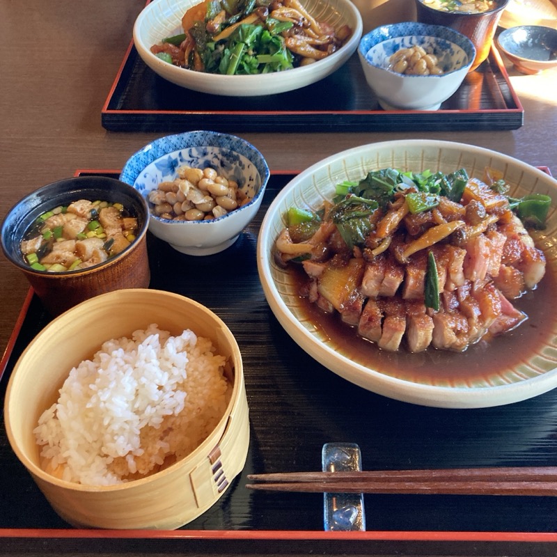 すると、普通に郊外の市中にありまして、確かに道を一本入りはするのですが、周辺はロードサイド店なども立ち並ぶ市街地でした、笑。土地勘がないにも程があるというか、取り越し苦労にも程がある💦。こんなことなら、もっと早く来ればよかった。開店直後は混みそうだったので、時間をずらして13時半ごろ到着。すると駐車場には車が一台もなし。「遅かったかな…」と恐る恐る奥へ歩いていくと「やってます」と味のある字で書かれた看板があり、ひと安心。中へ入るとご夫妻と思しきお二人が迎えてくださいました。「もう今日はお魚が終わってしまって、お肉だけですが」とのことでしたが、生姜焼きが食べたくて伺ったので、無問題。奥の小上がりに失礼して注文を済ませました。風情のある格子窓から緑豊かな景色を見ながらのんびり待っていると、程なくお膳が運ばれてきました。が、豪快すぎるメインのお皿に思わず目を見開きました。予備知識を凌駕する圧倒的なボリュームです。とんかつ屋さんもびっくりの極厚のロース肉が2枚?!というか、塊肉が2山。律儀に一口サイズにカットされてギュウギュウに盛られています。「食べ切れるかしら…」と不安がよぎります。付け合わせのお野菜もたっぷり、小鉢の煮豆に、わっぱに盛られた香りの良い釜炊きご飯、お味噌汁に至るまで、すべて丁寧に手をかけられた美味しさで濃いめの味付けではありますが、生姜焼きはこれくらいの方が満足できますね。